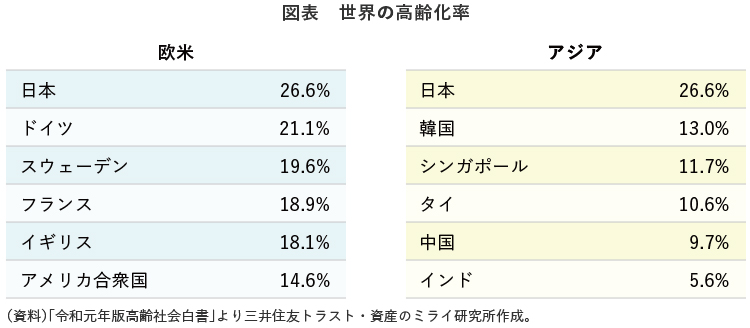 WHO(世界保健機関)が定める定義では、人口に占める65歳以上比率の上昇に応じて「7%以上:高齢化社会」「14%以上:高齢社会」「21%以上:超高齢社会」としていますが、日本はというと、1970年に「高齢化社会」、1994年に「高齢社会」、2007年に「超高齢社会」に突入しています。注目すべきは、「高齢化社会」から「高齢社会」までには、24年間かかっていましたが、「高齢社会」から「超高齢社会」まではわずか13年で到達している点です。この急ピッチな長寿化の進展は、少子化傾向と相まって「少子高齢化」と呼ばれ、政策課題として幅広く取り上げられています。
