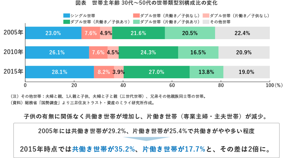 特に、ライフスタイルの変容は、家族のあり方や働き方に関する人々の意識の変化を表していると思われます。たとえば、女性の就業継続・復帰支援や家計状況などから「片働き世帯」の比率が下がり「共働き世帯」が伸びてきている点。また近年、未婚率が増加してきており、「シングル世帯」での生活を楽しむことも選択肢の1つとして広まってきていること。結婚後もお子様をもたないという世帯も増えてきており「だれと一緒に過ごすのか」という人生の過ごし方も多様化し、今後、さらに様々な可能性があらわれてくると思われます。