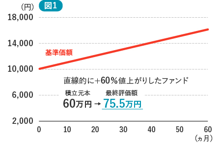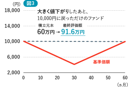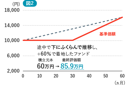 図1のファンドはまったくブレることなく上昇しており、確かに素晴らしい推移です。しかしそのファンドに毎月1万円ずつ60ヵ月(5年)積立をしていった元本60万円の結果は、図2の結果に負けています。図2のファンドは積立中の前半はフラットに推移し、後半に盛り返していますが、前半に安い値段で多くの口数を「仕込んで」いたことが奏功しているのです。