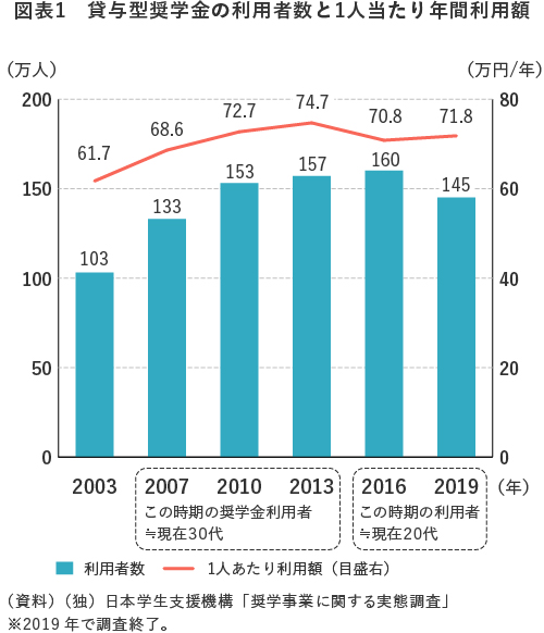 (独)日本学生支援機構の調査によると、貸与型奨学金の利用者数は、2003年の103万人から16年には160万人まで増加、19年には145万人となっています。1人当たりの利用額(貸与額)も、03年には平均で1年間に61.7万円でしたが、10年以降は年間70万円を超えています(図表1)。