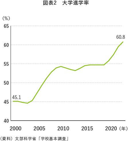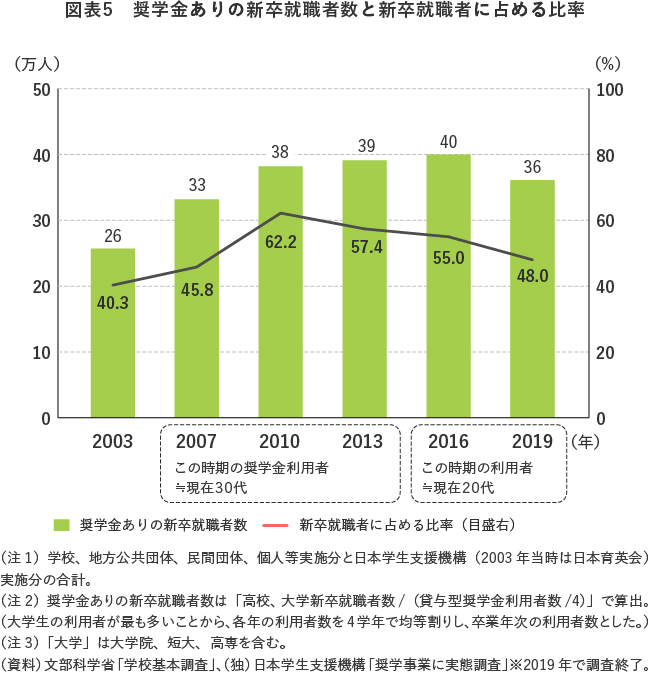 奨学金の返済負担を抱えて社会人となる人の数は、2003年時点では26万人でしたが、10年以降は40万人前後で推移しています。新社会人(新卒就職者)全体に占める比率は、03年の4割からピーク時10年には6割超に。その後はやや低下していますが、2019年でも5割弱います(図表5)。