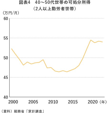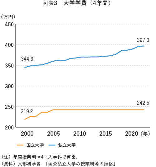 大学進学率がこの20年余りで45.1%→60.8%へと高まり(図表2)、4年間の学費も、国立大で219万円→243万円、私立大では345万円→397万円と上昇する中で(図表3)、親の所得は2015年前後まで下落傾向が続いていた(図表4)ことを考えれば、奨学金の利用増加にもうなづけます。