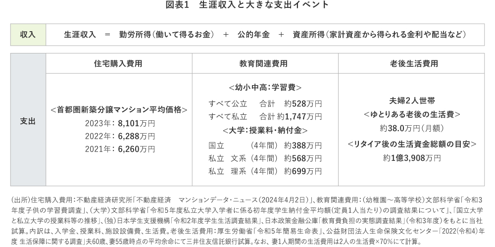 例えば、ミライ研で一般的な勤労者世帯における平均的な生涯収入を試算したところ、約3.8億円となりました。生涯収入は、(図表1収入欄)掲載の式でイメージできます。これは、人生において使えるお金のボリュームともいえます。人生の支出面における大きな影響として、住宅購入費用、教育関連費用、老後生活費用を考えてみます(図表1支出欄)。平成から令和にかけて住宅価格は大幅に高騰し、教育関連費用も相当な規模感で推移しています。老後生活費用の平均的な目安は約1.4億円となっています。