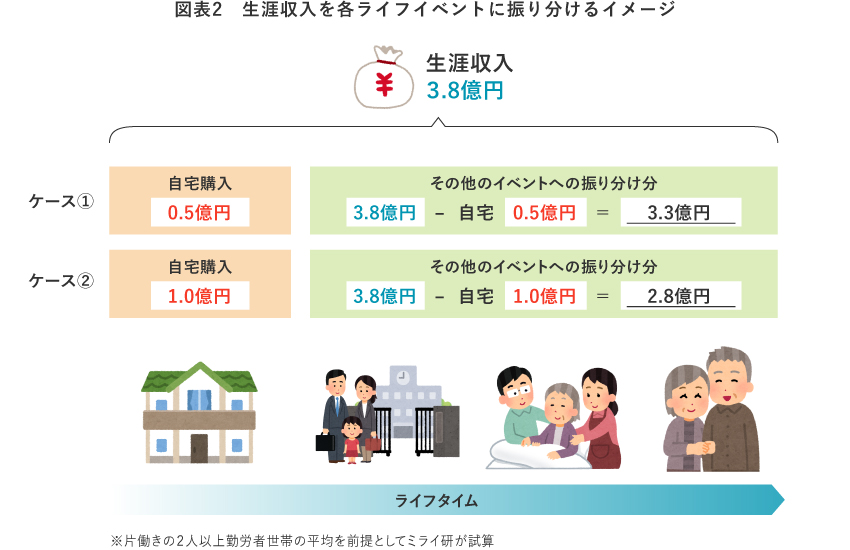 (図表2)ケース①は、生涯収入を3.8億円とした場合、ローンで0.5億円の自宅を購入するケースです。「人生の財布の大きさ」は決まっていますので、自宅購入に0.5億円を振り分けると、教育関連費用、介護費用、老後生活費用などその他のイベントに振り分けられる金額は3.3億円となります。