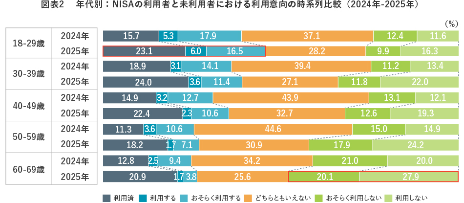 さらに、このデータを年代別に分析すると、18-29歳以下のNISA検討とNISA利用が最も進み、かつ、60代の「利用しない」層が顕著に多くなっていることが分かりました【図表2】。