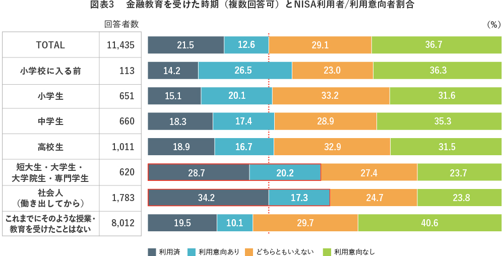 【図表3】のとおり、どこかしらの“場”で、金融教育を受けた経験がある人は、NISAの利用済+利用意向ありの割合が、未経験者に比べて大きくなっていました。