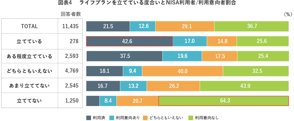 また、【図表4】のとおり、「ライフプランを立てている人」は、そうでない人に比べて顕著にNISAの活用が進んでいます。