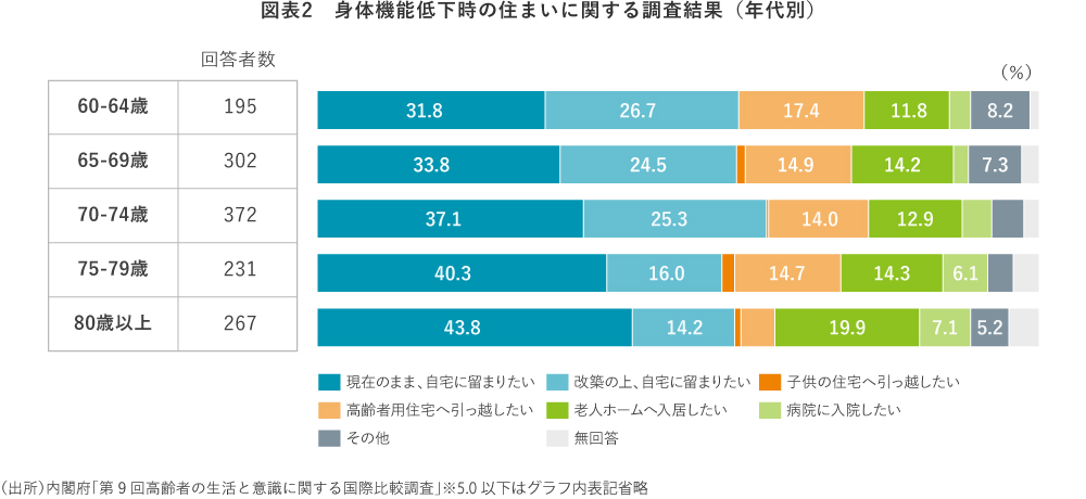 また、希望する住まい形態を年齢ごとに点検してみると、高齢になればなるほど「現在のまま、自宅に留まりたい」を望む比率が多くなっています。具体的には、60-64歳で31.8%だった比率は徐々に高まり、80歳以上では43.8%に達しています。