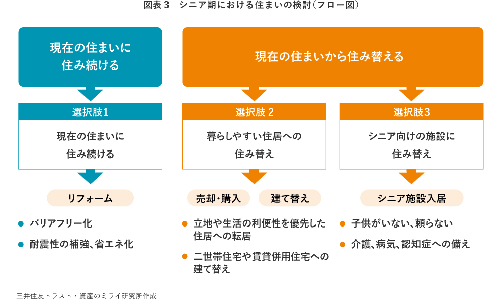 【図表3】は、シニア期における住まいの検討をフロー図にしたものですが、こういった選択肢や判断から連なる次の選択肢への判断などを考えると、シニア期の住まいの選択は、合理的な判断ができ自分の環境を変化させることに心理的な拒否反応が少ないであろう50-60歳代において、将来の自身の状態を想定しつつ検討に必要な情報を摂取し、「(自分にとっての)住まいの選択肢、およびその時点での住まいの判断」が行えるようにしておくことが、本当に大切になってきたといえます。