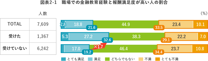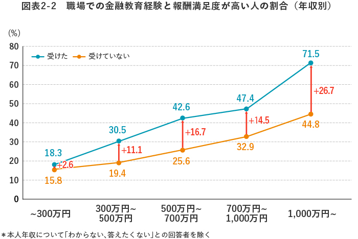 例えば、職場での金融教育経験がある人は、そうでない人に比べて、報酬満足度が高い人の割合が1.7倍に増えています【図表2-1】。両者の差は、年収が上がるほど顕著に広がっていることが分かりました【図表2-2】。