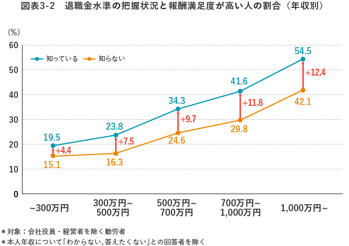 また、報酬には定例給与などに加え、原則退職時に支給される「退職金」などもあります。この退職金の水準を把握している人は、そうでない人に比べて、報酬満足度が高い人の割合が1.9倍と、大きな差となりました【図表3-1】。こちらも、年収が上がるほど、この差が顕著に広がっています【図表3-2】。